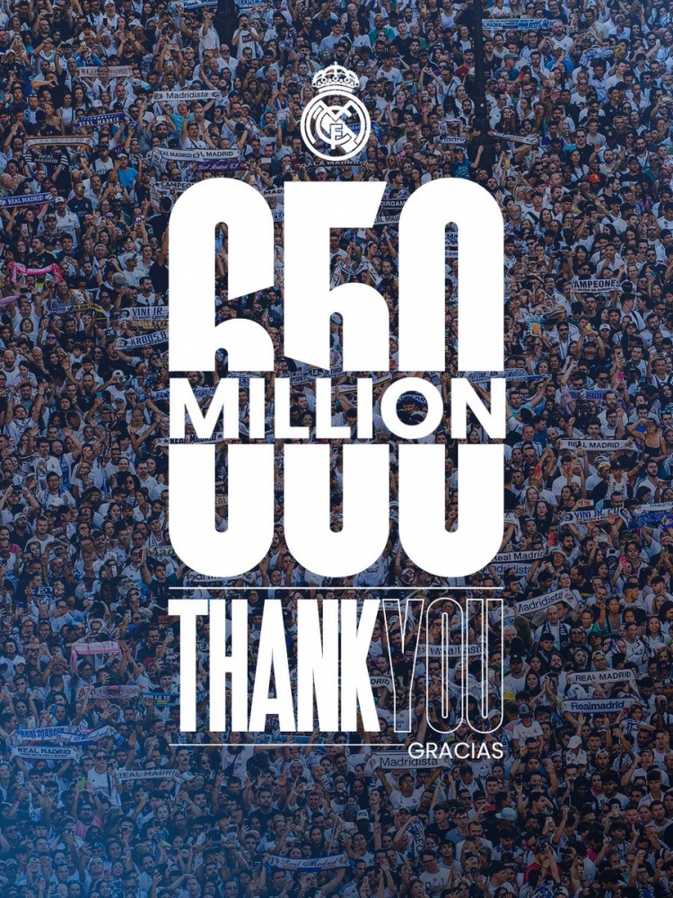 官方账号发文表示:"我们迎来了6.5亿粉丝!全球最伟大的球迷群体属于皇马!衷心感谢每一位支持者!"